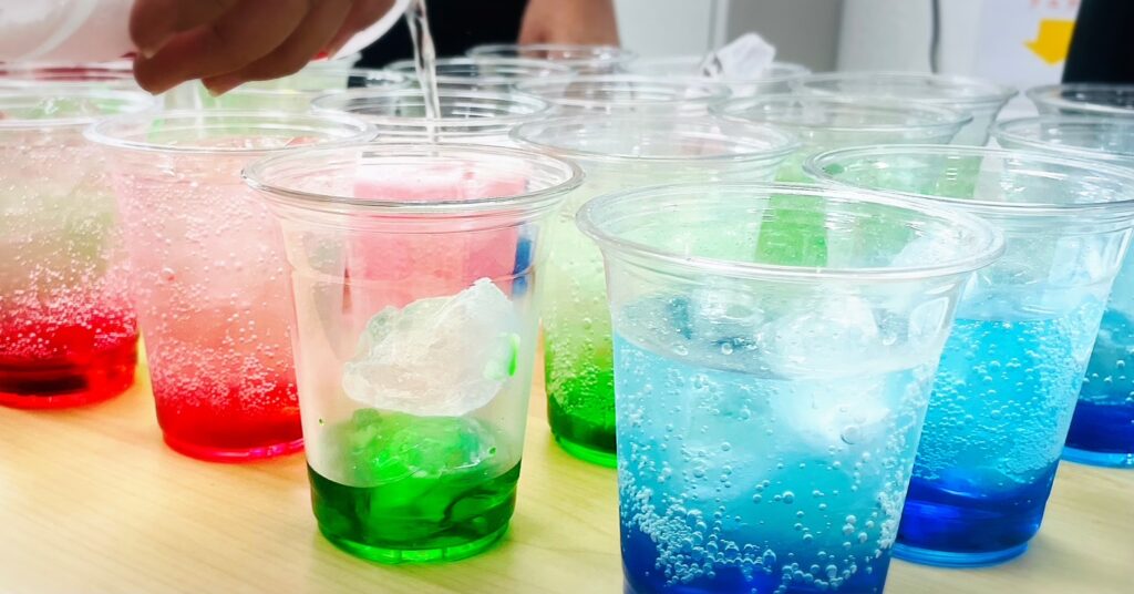 カラフルジュースは好みのシロップを選んで炭酸で割ってさらにアイスクリームを乗せました。